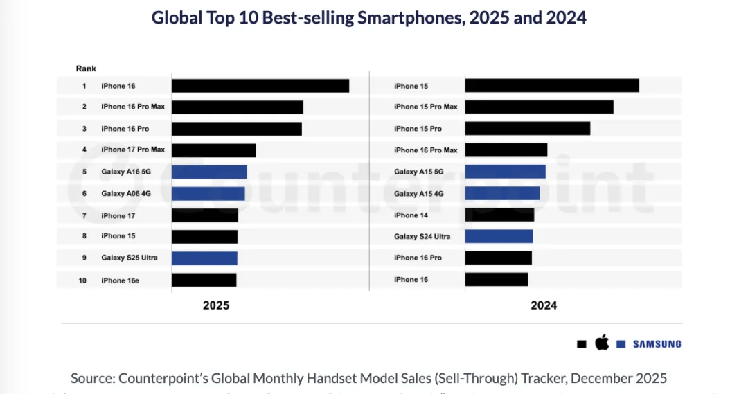 作为补充,没发布几个月的iPhone 17 Pro Max和iPhone 17还曾跻身2025年第四季度全球市场卖最多的TOP10单品手机榜,不得不说这次17系列是真的猛啊,不知道这里面有没有你贡献的?