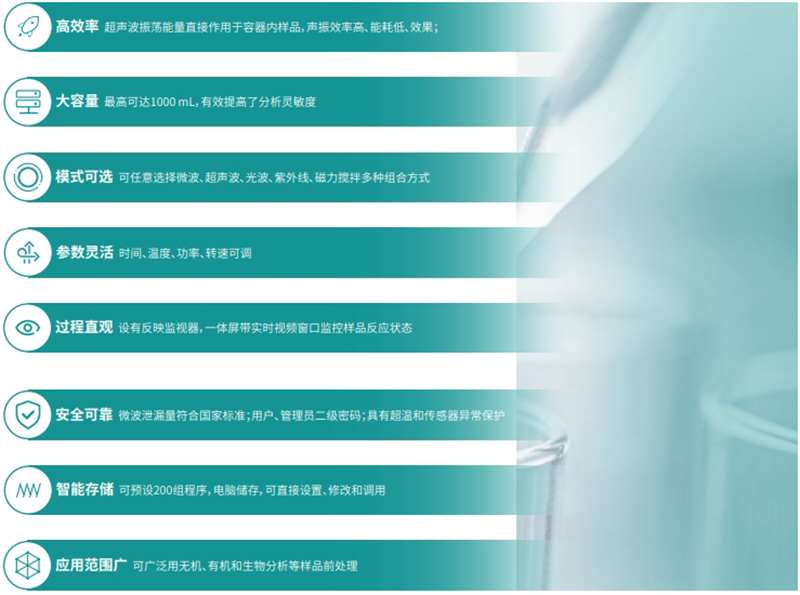• 模式可选可任意选择微波、超声波、光波、紫外线、磁力搅拌多种组合方式;