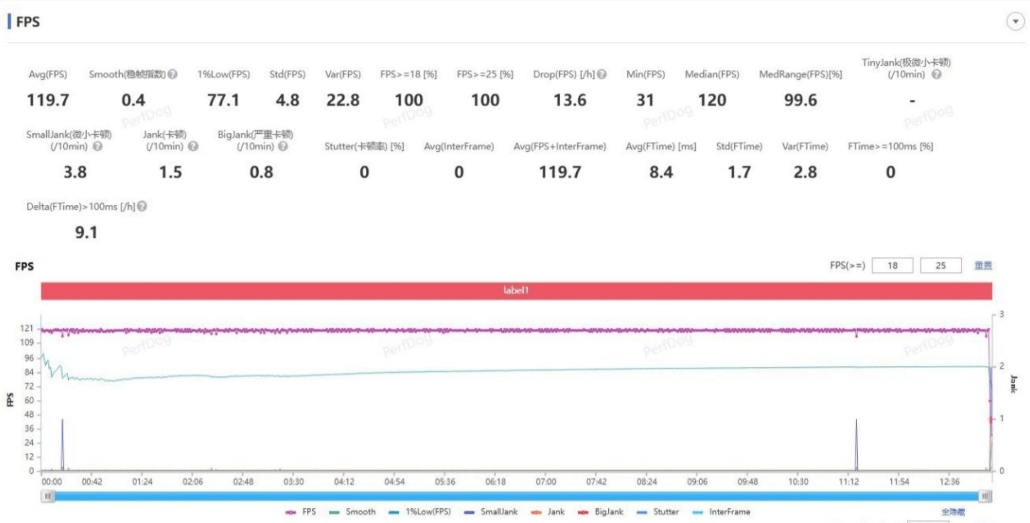 我们上手跑了几款主流的游戏,运行《王者荣耀》开启最高画质+120fps插帧,在团战帧率可以稳定在120Hz左右,没有出现任何卡顿和掉帧,虽然机身背部会有轻微发热的现象,但是得益于荣耀的能效芯片的加持,手机没有出现芯片过热CPU降频的现象,整体游戏都运行非常流畅。