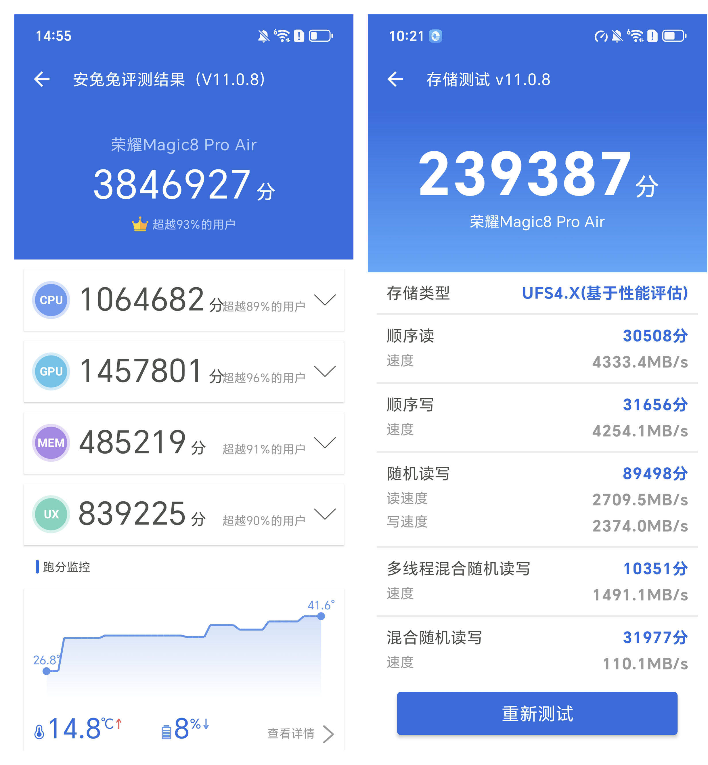 接下来,说下大家很关心的性能,作为荣耀的magic系列的旗舰机,荣耀的Magic8 Pro Air给上了一颗联发科的天玑9500旗舰芯片,这是一颗目前最强的手机芯片,荣耀和联发科联合调校,加上荣耀的自研能效增强芯片HONOR E2的加持,让这颗芯片的性能释放非常激进,与此同时,还不会因为过热而导致降频,毕竟机身做得这么轻薄,是非常考验手机厂商对芯片性能的调校的。